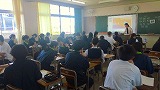 全校集会にて9月に行われた「第31回愛知県高等学校スピーチコンテスト西三河地区予選会」に2年生2名が出場し、うち1名が県大会に出場しました。思いのこもったスピーチを全校生徒の前で堂々と披露してくれました。